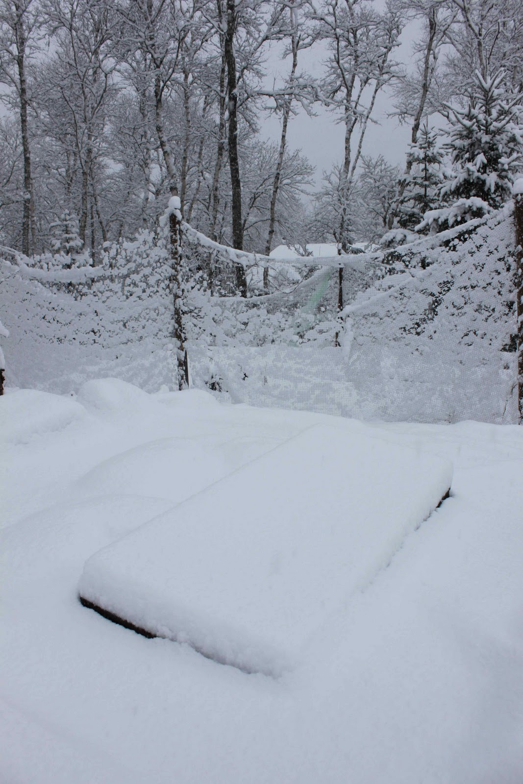 Well, I'm not sure how the last-minute shoppers are feeling, but it sure is nice to see a bit of white stuff before Christmas! We expected 2 to 4 cm (1 to 2 inches), but we ended up with 15 cm (6 inches)! Now that the barrage of fluffy snowflakes seems to be slowing, I thought I'd run up to take a few photos of the snow-covered garden. It's such a thick layer of snow, however, that it's hard to even see where the cold frames are hidden! I should probably shovel them off, but I know the snow will just add an insulating layer to them, protecting the veggies within from any cold weather. Therefore, I will just leave the snow for a few days. If it doesn't melt off by then, I will give them a quick cleaning.